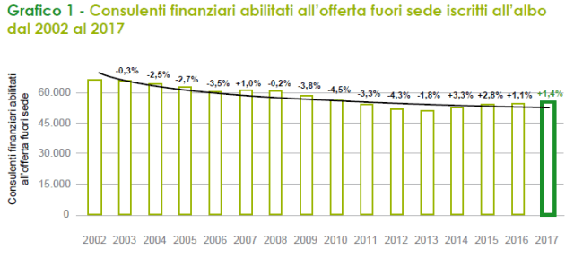 lieve entità, del numero degli iscritti all’albo; i consulenti finanziari sono l’1,4% in più rispetto al 2016, con una crescita pari all’8% negli ultimi 5 anni.