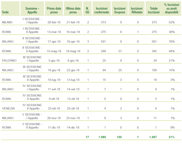 Al netto delle iscrizioni presentate dai soggetti che hanno ripetuto l’esame in più sessioni, le domande pervenute sono state n. 4.059 (n. 3.547 nel 2016) e alle