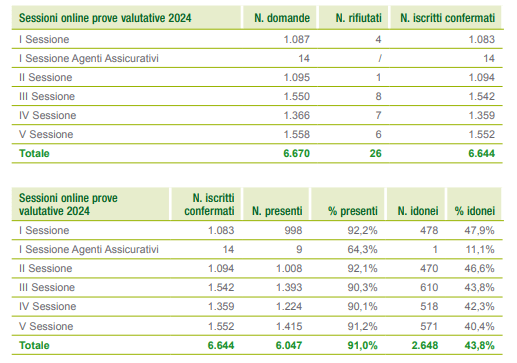 Nel 2024 le prove valutative, tenutesi nella modalità “a distanza”, sono state suddivise in cinque sessioni e due appelli mensili, per un totale di dieci appelli nell’anno e cinquantaquattro giornate previste a partire dal mese di febbraio fino a dicembre 2024, con l’esclusione del mese di agosto. È stata indetta altresì una sessione della prova valutativa dedicata alle persone fisiche iscritte nella sezione A del Registro Unico degli Intermediari assicurativi, anche a titolo accessorio, e riassicurativi (RUI).