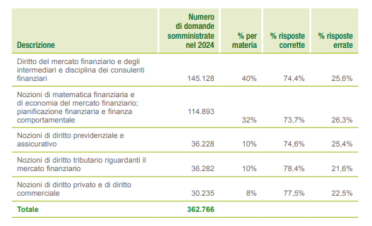 La materia più complessa per i candidati partecipanti alle prove nel 2024, come nel 2023, risulta essere “Nozioni di matematica finanziaria e di economia del mercato finanziario; pianificazione finanziaria e finanza comportamentale”.