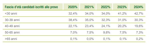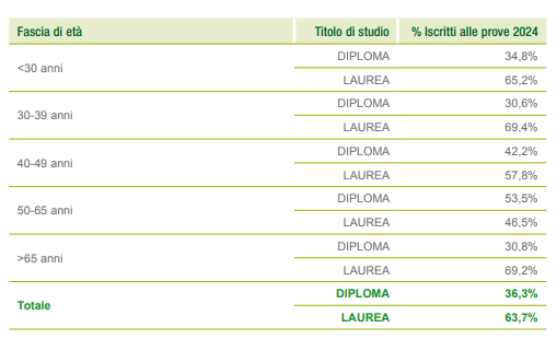 Se si analizza la composizione dei candidati per fasce di età e titolo di studio, si rileva che nel 2024 gli aspiranti fino a 50 anni sono prevalentemente in possesso di laurea (65,1%), mentre per gli over 50 si registra una leggera prevalenza del titolo di diploma (52,9%).
