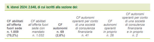 Il 70,2% (n. 1.859) dei candidati risultati idonei nel 2024 si è iscritto all’albo nella sezione dei consulenti finanziari abilitati all’offerta fuori sede e di questi il 55,5% (n. 1.032) ha ottenuto un mandato da parte di un intermediario autorizzato.