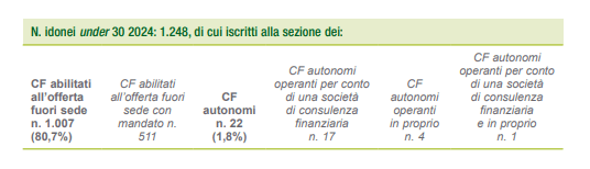 Focalizzando l’attenzione sui neo-consulenti under 30, sono risultati idonei n. 1.248 giovani, di cui l’80,7% (n. 1.007) risulta iscritto all’albo nella sezione dei consulenti finanziari abilitati all’offerta fuori sede e di questi il 50,7% (n. 511) ha sottoscritto un mandato ad operare.