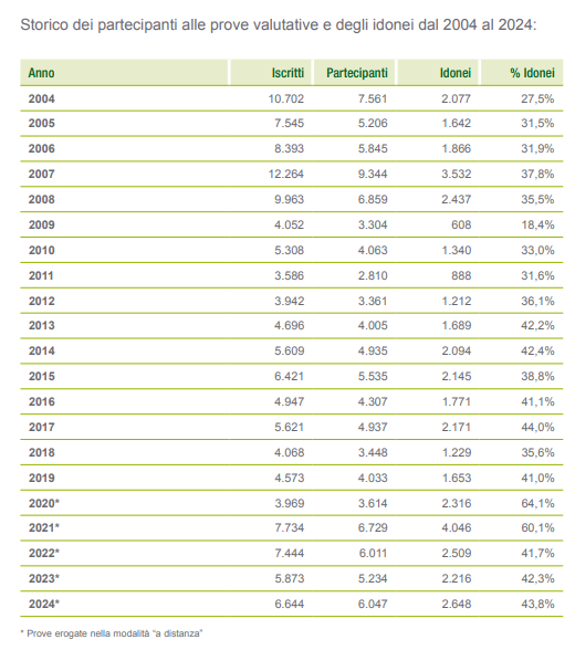 Il voto medio conseguito dai candidati risultati idonei è stato 88,1/100, in leggero aumento rispetto al 2023 (87,9/100). Si ricorda che per il superamento della prova valutativa è necessario conseguire un punteggio minimo pari a 80/100.