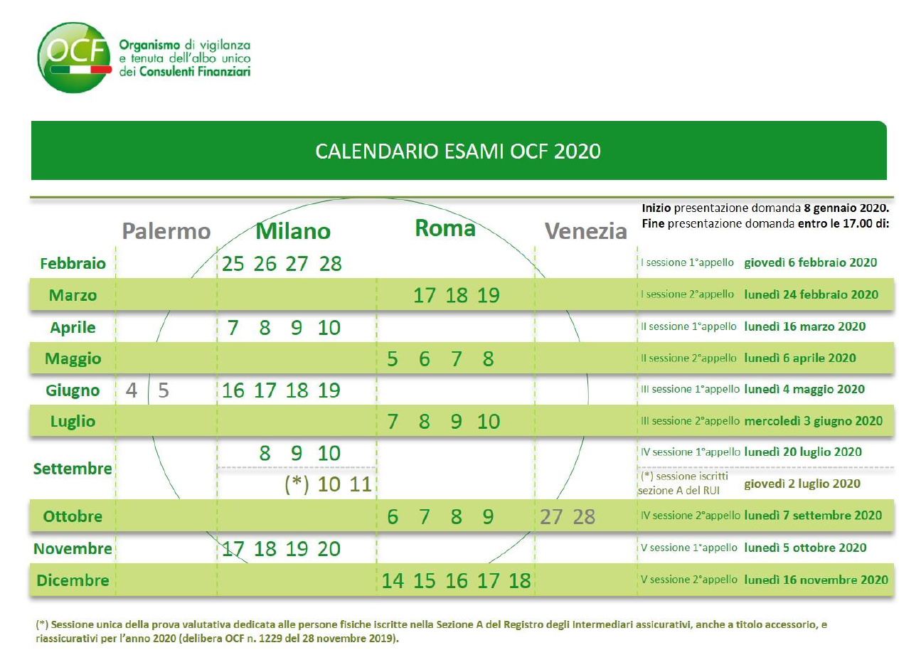 L’OCF ha pubblicato la delibera n. 1228 del 28 novembre 2019 che riportiamo di seguito con cui indice 5 sessioni d’esame per il 2020 per l’iscrizione all’albo unico dei consulenti finanziari.